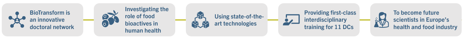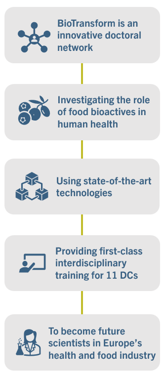 BioTransform is a multidisciplinary doctoral network (DN) aiming to investigate the role of health promoting constituents found in food products (food bioactives – FB), focusing on their metabolism. Even though the role of the gut microbiome is nowadays considered imperative in health homeostasis and disease prevention, the available information regarding gut microbiome-driven FB biotransformations after food intake remains scarce and highly unexplored even regarding common food products. Thus, the goal of BioTransform is to combine state-of-the-art methods, technologies and approaches in a complementary and integrated way to reveal the role of metabolism in the digestive tract, and the impact of FB and their metabolites (biotransformation products) on health and disease. To this end, human pilot studies, in vitro and in silico metabolism simulation methods, gut microbiome sequencing, metabolite profiling and metabolomics will be employed. The BioTransform objectives will be accomplished through 11 complementary doctoral projects from 9 education and research entities, additionally including the participation of 6 associated partners from the private sector and one from academia.