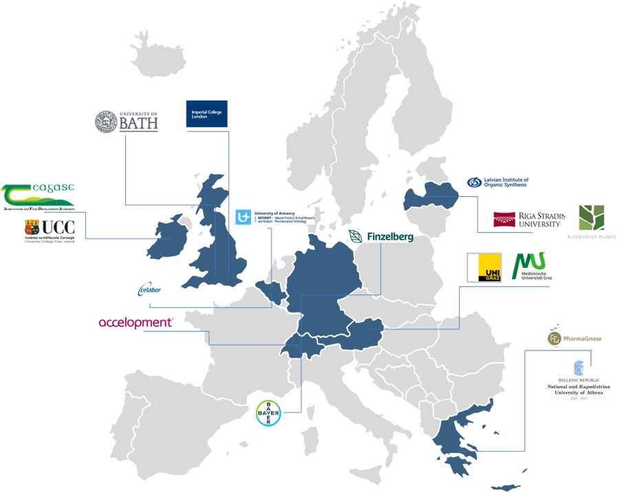 The Beneficiaries include leading universities and research institutes (NKUA-Med, NKUA-Pharm, MedUniGraz, UGraz, Teagasc, UCC, UAntwerp, RSU, UBath, ICL) with expertise spanning clinical research, pharmacology, metabolite profiling, microbiome science, colon simulation models and translational biopharmaceutics. The Associated Partners comprise 4 companies active in natural products and botanical manufacturing (Alternative Plants, PharmaGnose, Finzelberg, Steigerwald), one agri-food scientific and technical services centre (CELABOR), one research institute (LIOS), and one SME (accelCH) specialised in transferable skills training, outreach and project management.